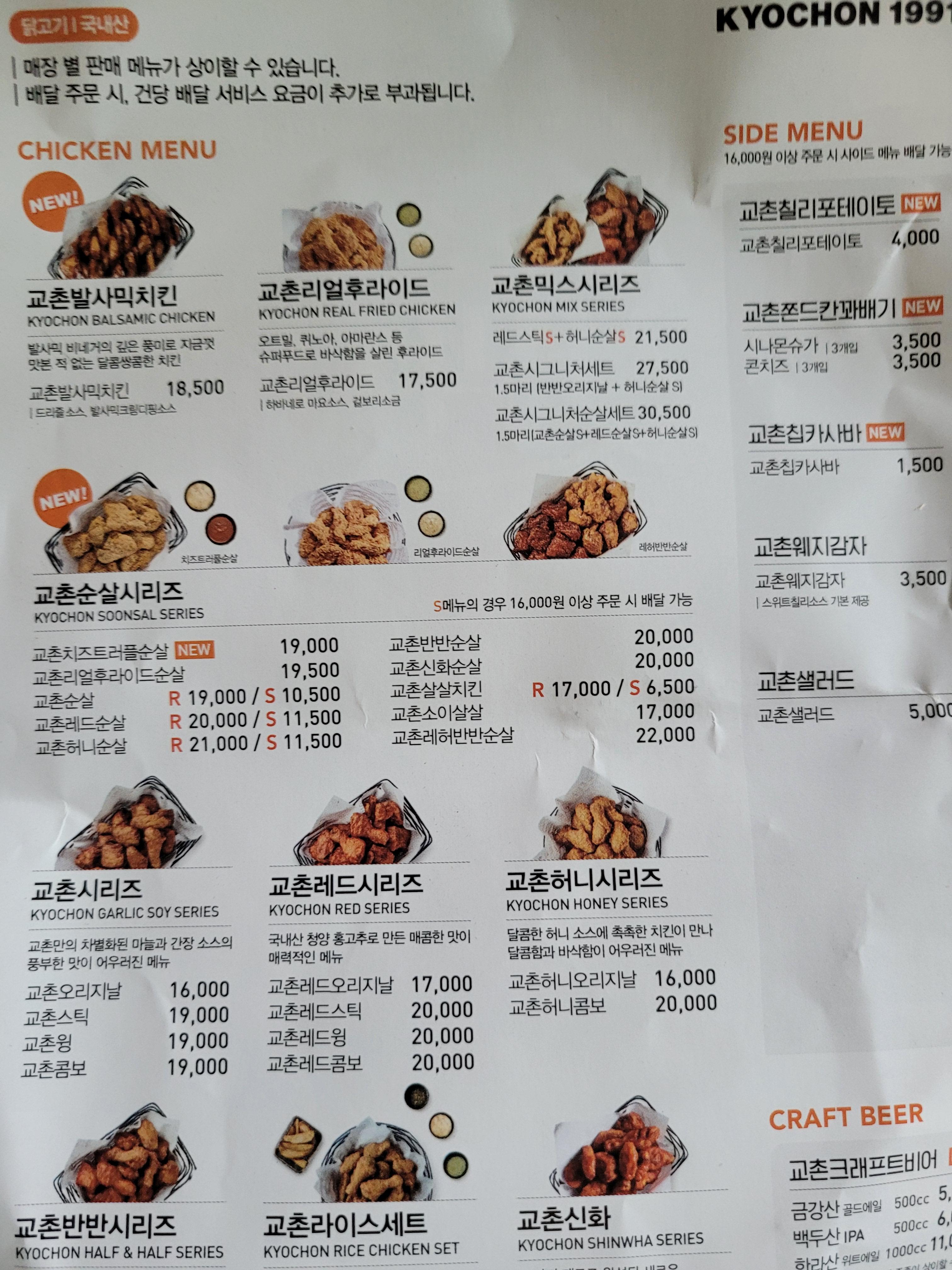 맛있는 치킨 종류와 사이드 메뉴가 있는 것